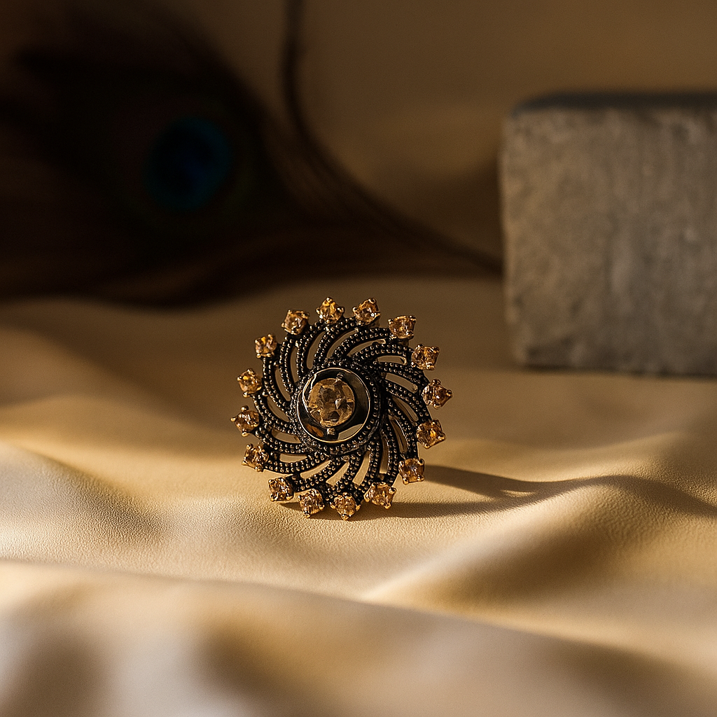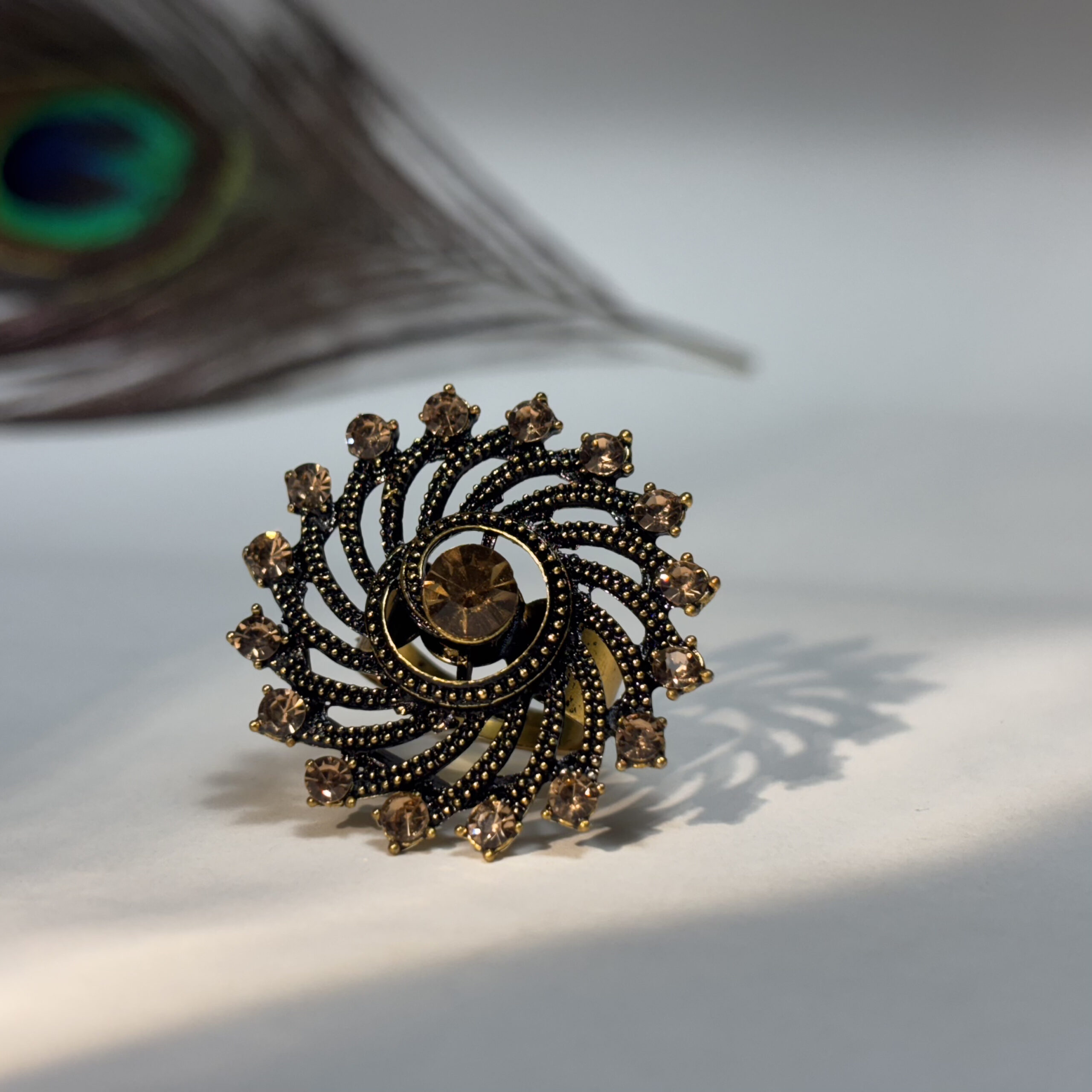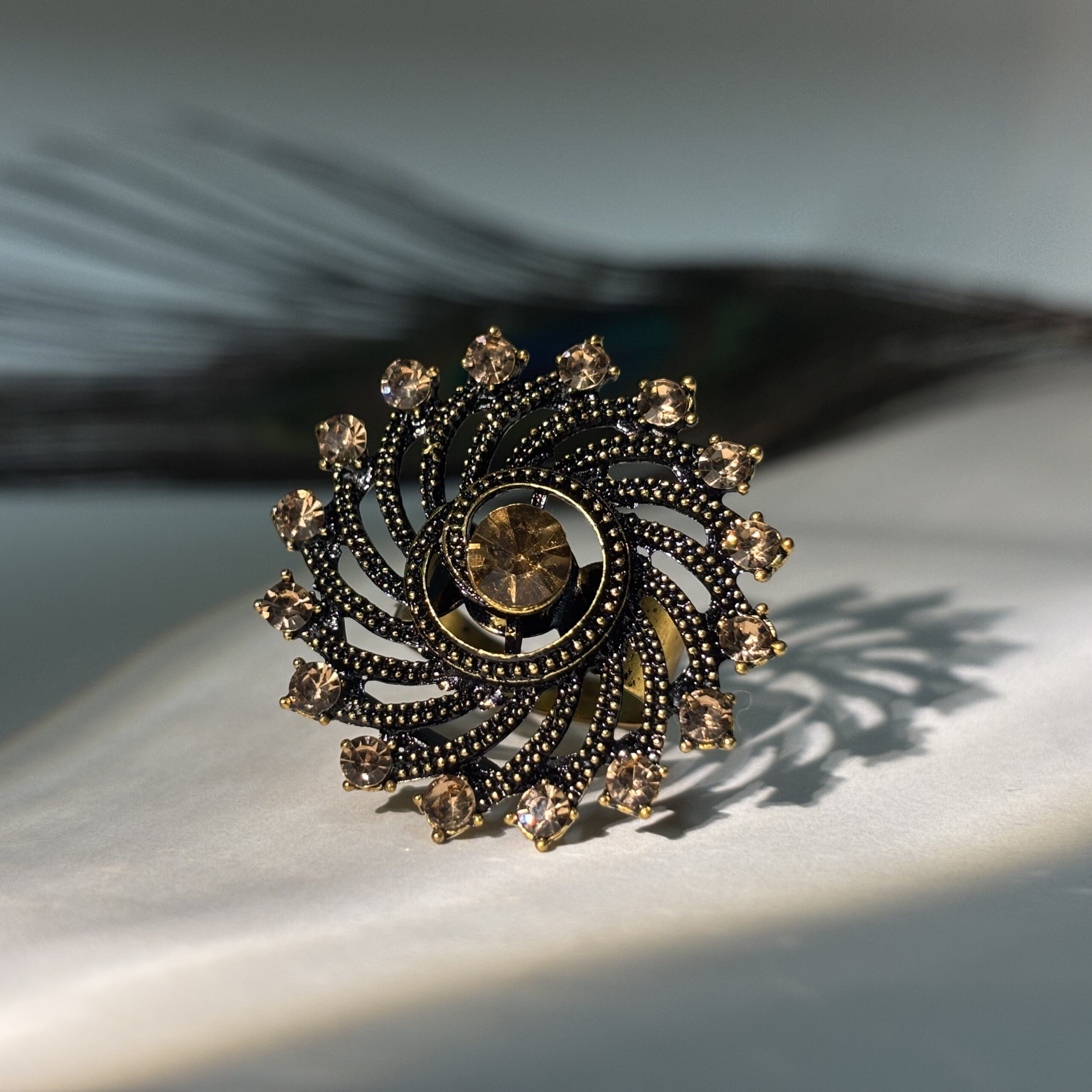Add a bold touch of elegance to your collection with this antique gold-plated spiral finger ring, designed with a stunning swirl pattern adorned with sparkling crystal stones. The unique spiral motif symbolizes grace and energy, making it a standout accessory for weddings, festive occasions, or evening parties. Handcrafted with intricate detailing and a vintage finish, this adjustable ring ensures a comfortable fit for all sizes. Perfect to pair with ethnic wear, Indo-western outfits, or contemporary dresses, it’s a must-have for jewelry lovers.