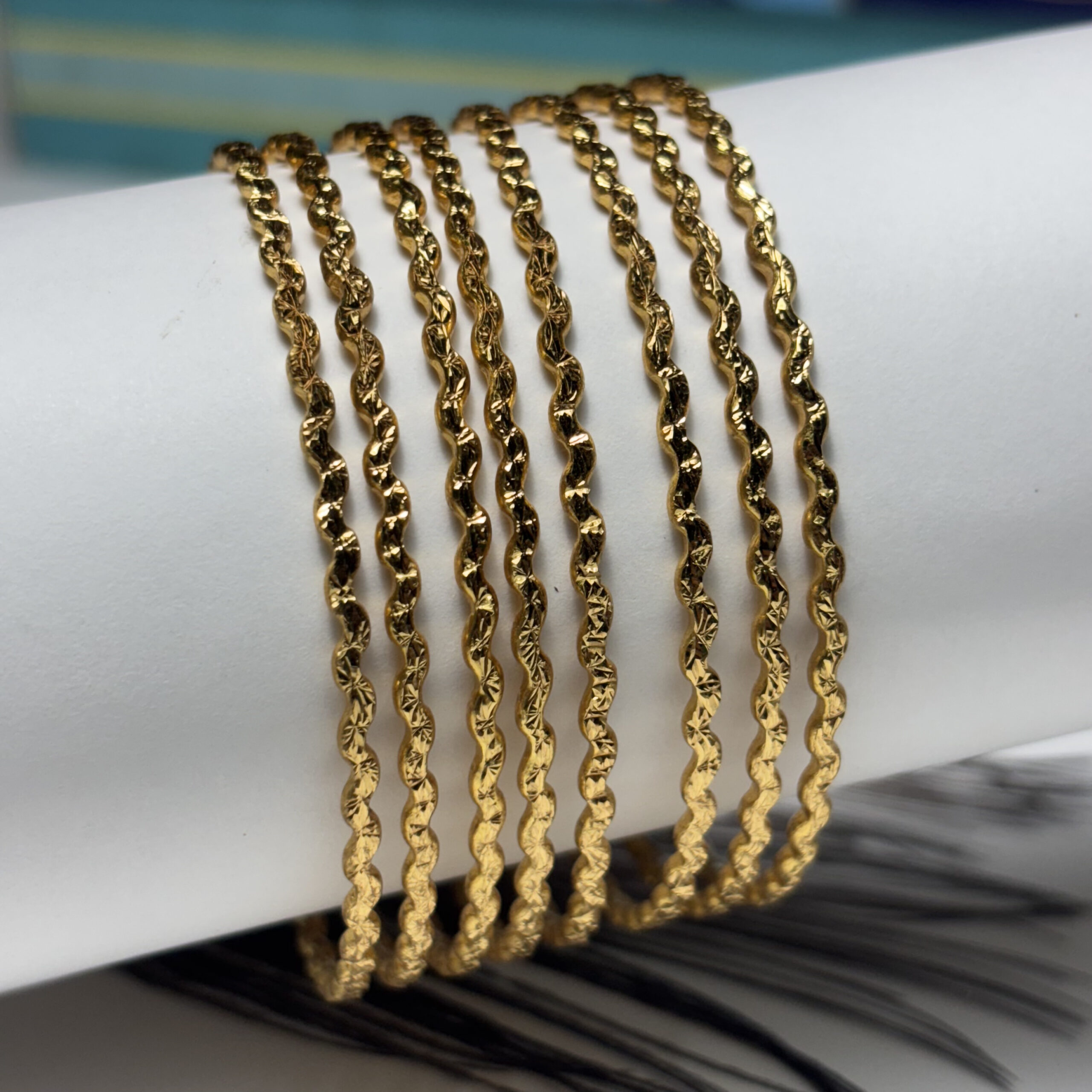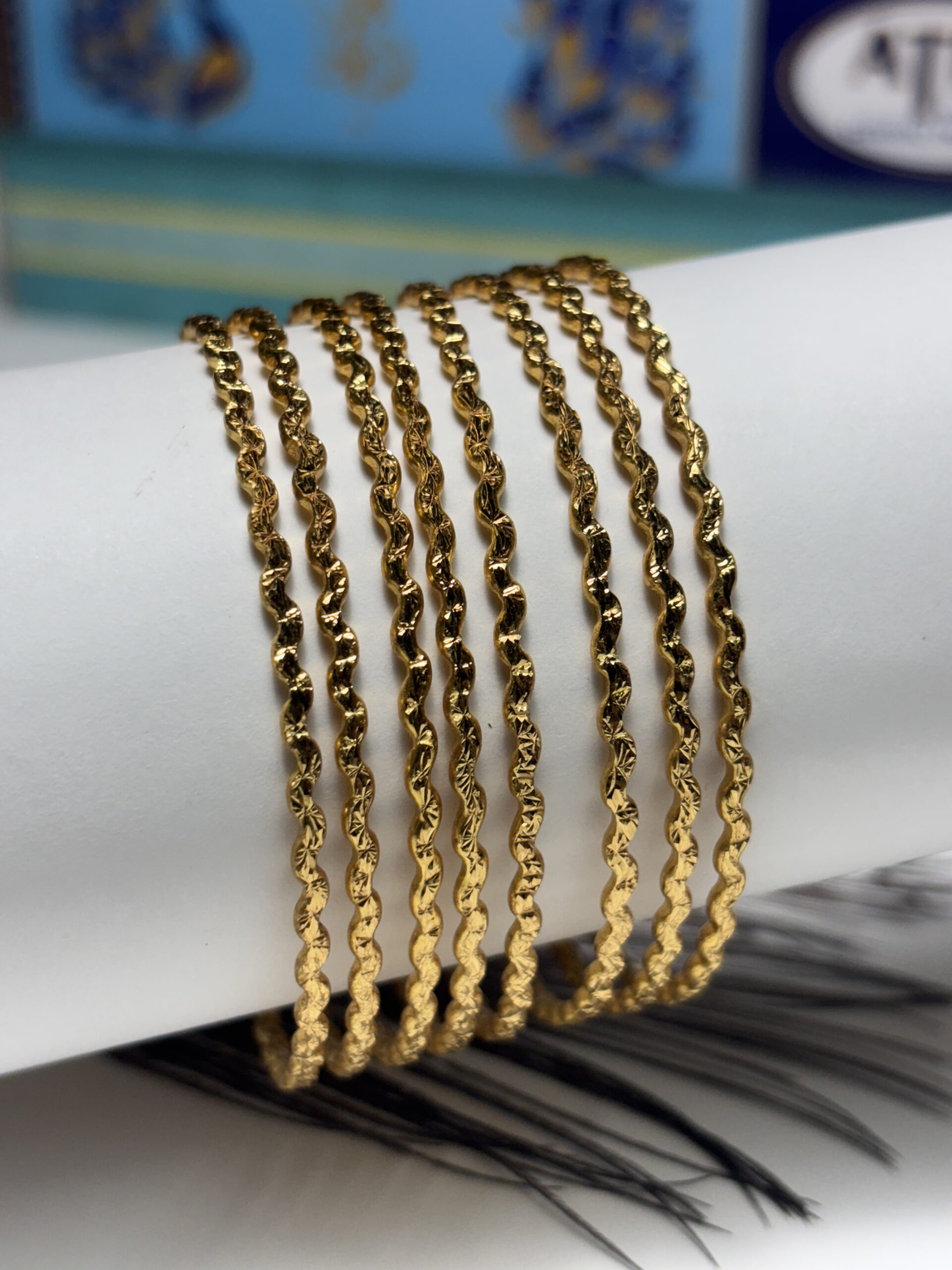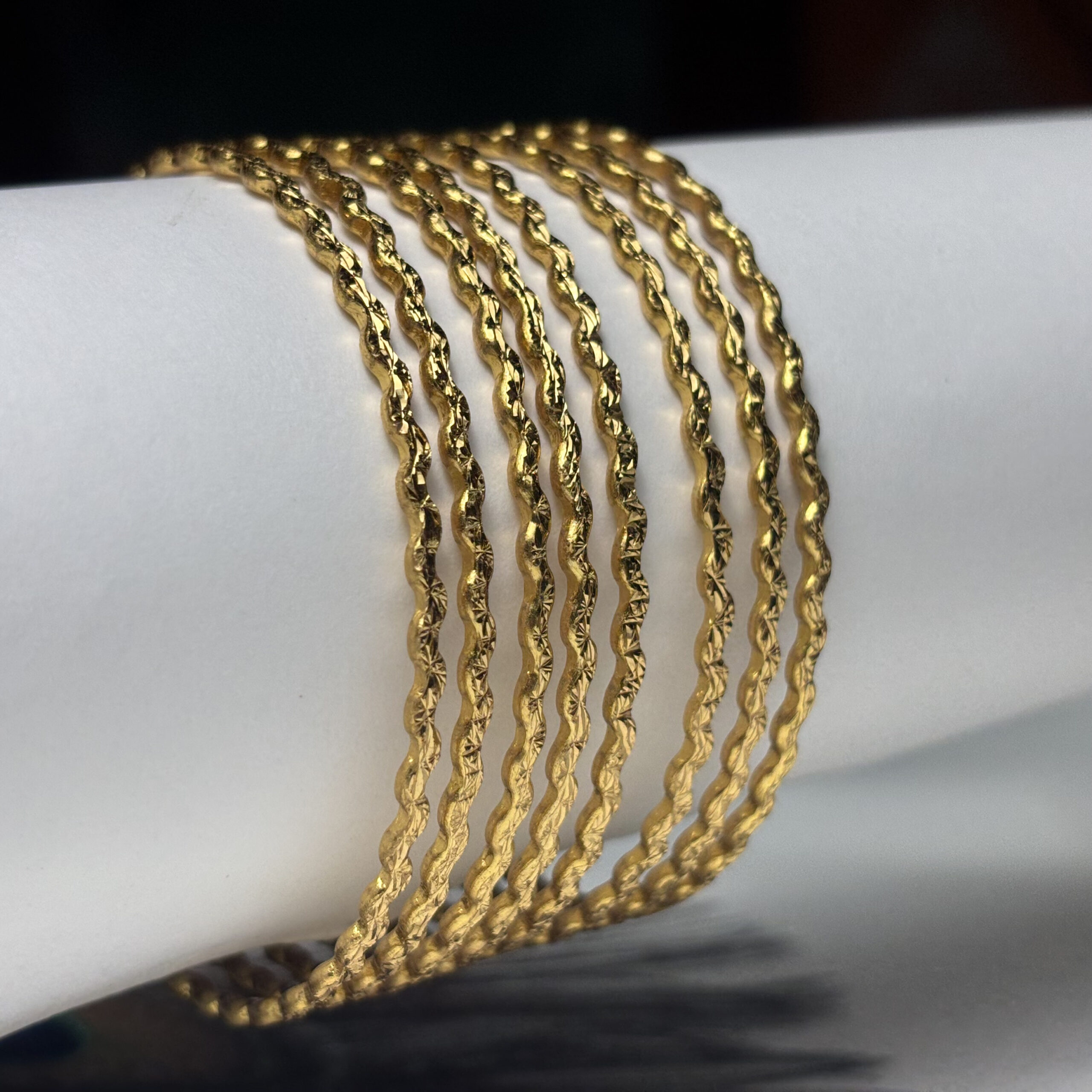 Add timeless elegance to your jewelry collection with this beautifully crafted set of 6 gold-plated bangles. Designed with a unique twisted rope pattern and intricate detailing, these bangles combine tradition with modern charm. Perfect for weddings, parties, festivals, or everyday wear, they offer a lightweight yet premium look. A versatile accessory that complements both ethnic and western outfits, making it an essential piece for every woman’s jewelry box.