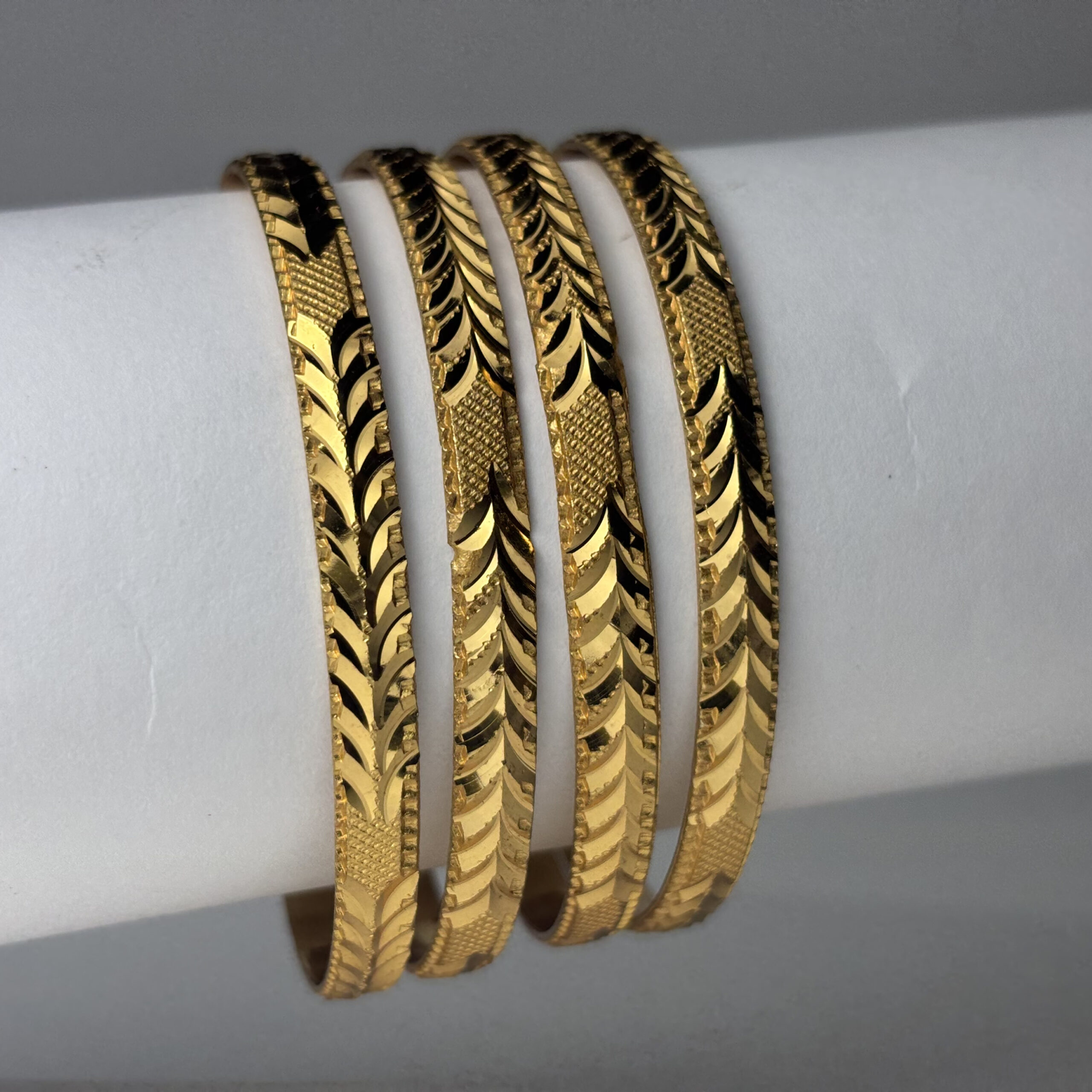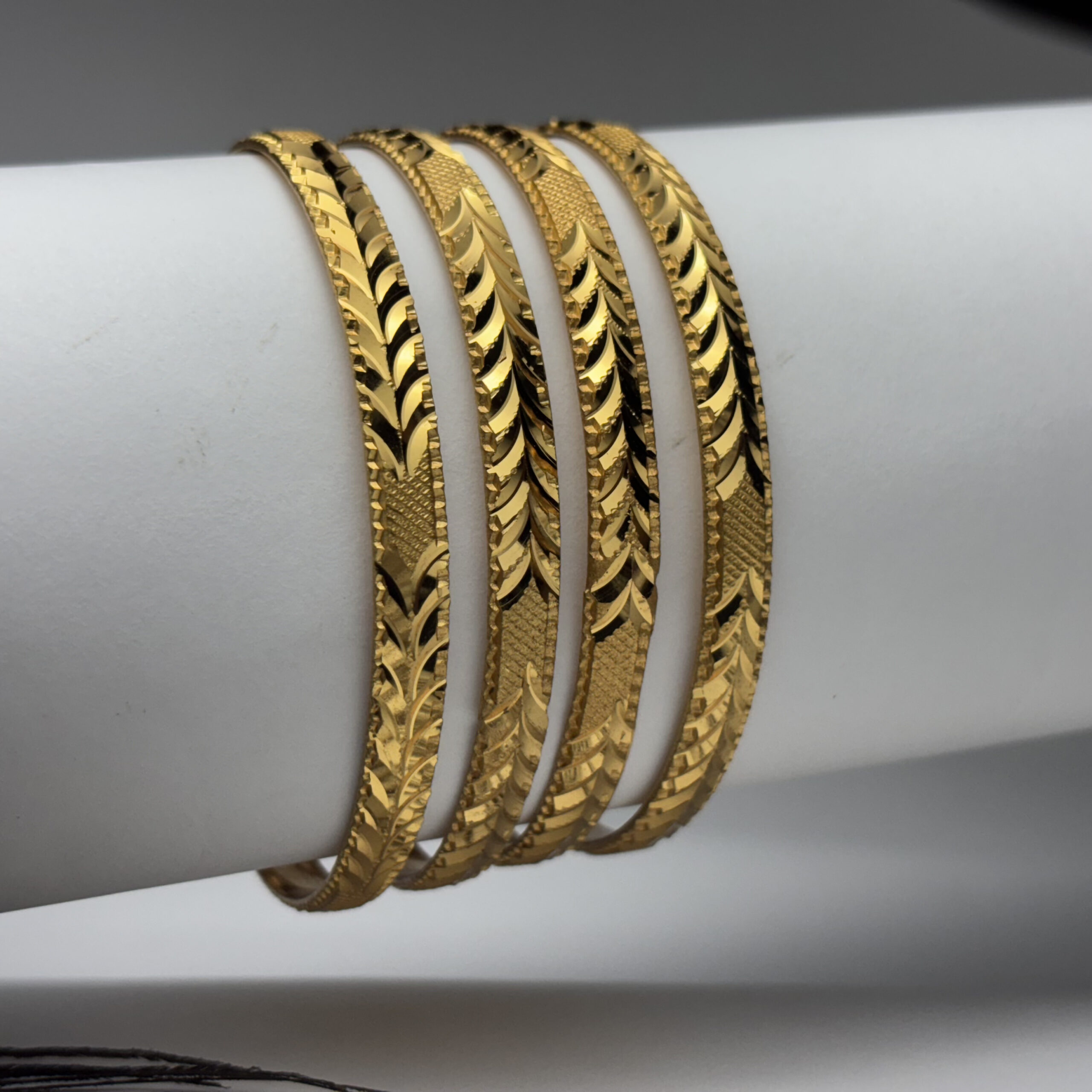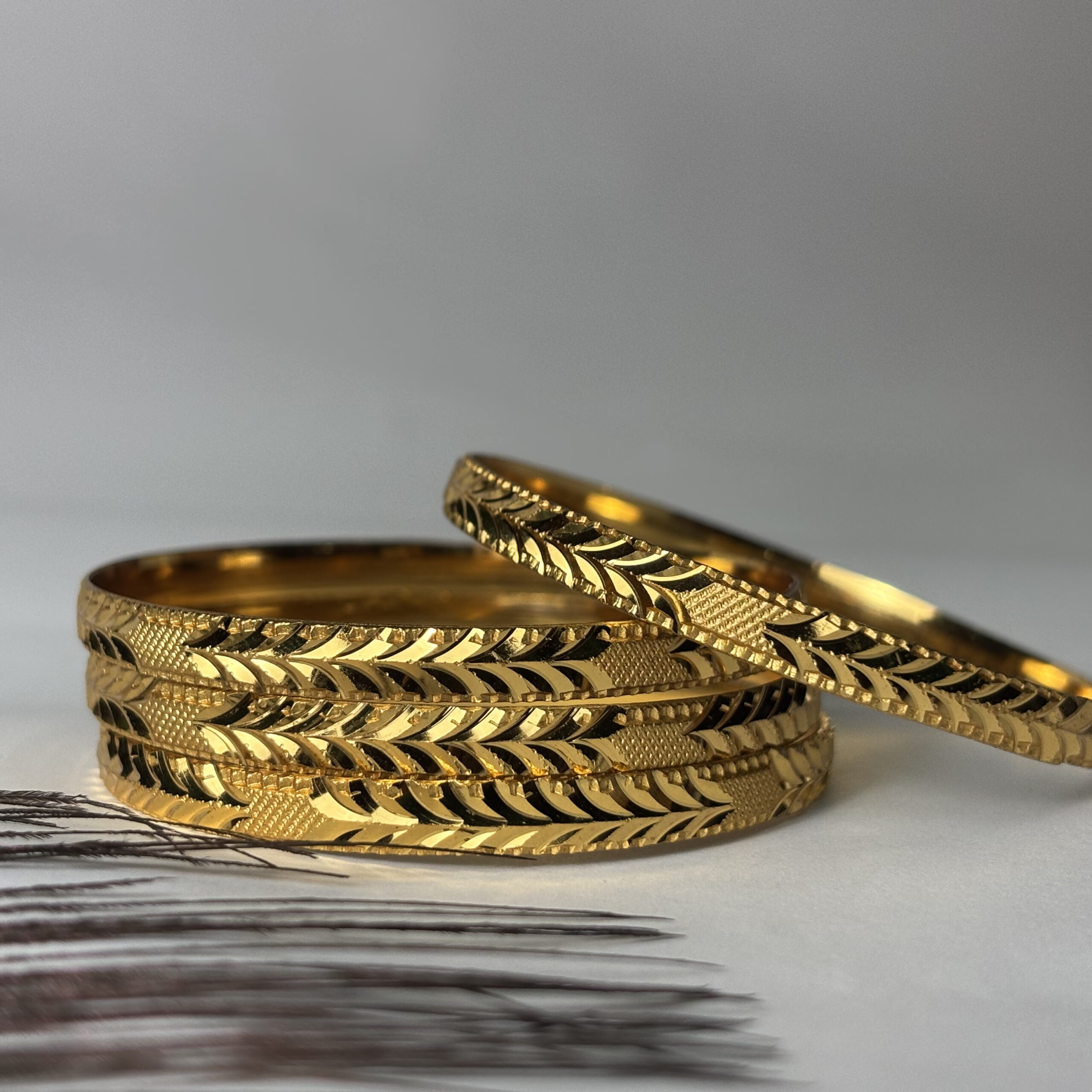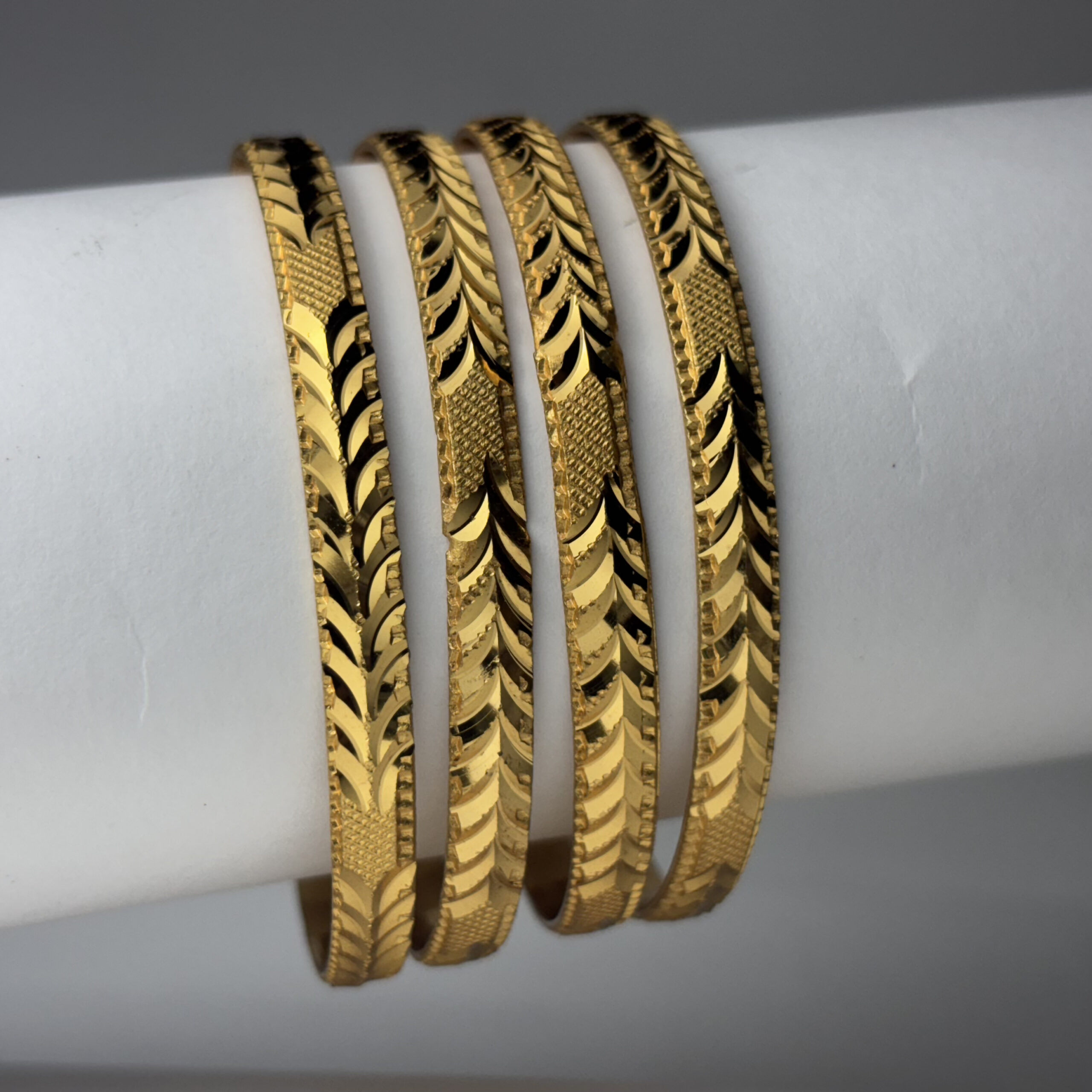 Enhance your ethnic look with this elegant set of gold-plated bangles, crafted with a striking matte finish and detailed leaf pattern engraving. These imitation jewelry bangles offer the beauty of real gold without the price, making them perfect for weddings, festivals, or everyday traditional wear. Designed for comfort and style, the bangles are lightweight, skin-friendly, and suitable for all-day use. Their premium finish and intricate detailing make them a standout accessory for any occasion.