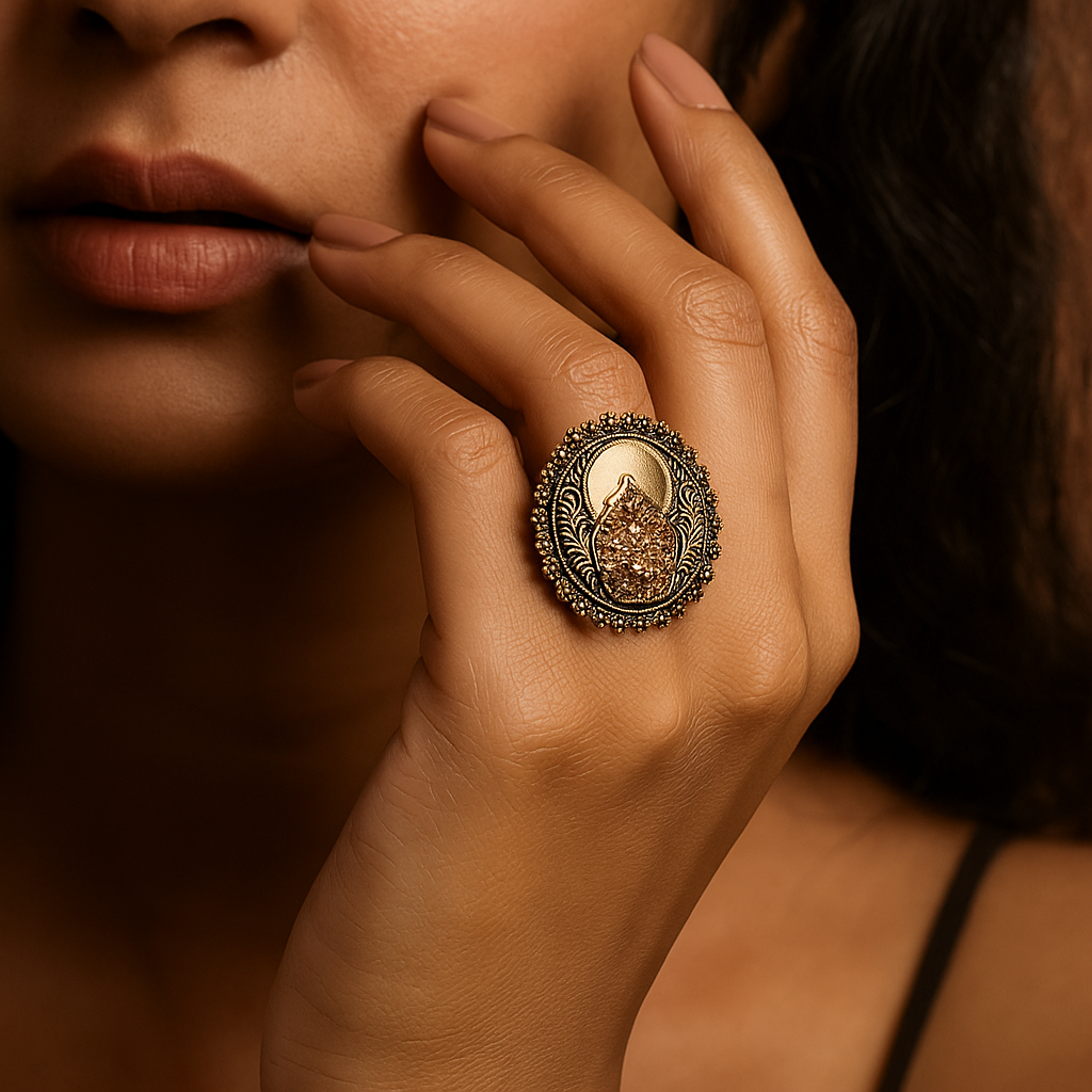 Add a touch of timeless elegance to your jewelry collection with this vintage gold-plated antique finger ring. Designed with intricate detailing, sparkling crystal stones, and a bold circular design, this statement ring is perfect for traditional occasions, weddings, and festive wear. Its adjustable band ensures a comfortable fit for all sizes, while the unique handcrafted finish highlights classic Indian artistry. Pair it with ethnic attire or fusion outfits to make a graceful impression.