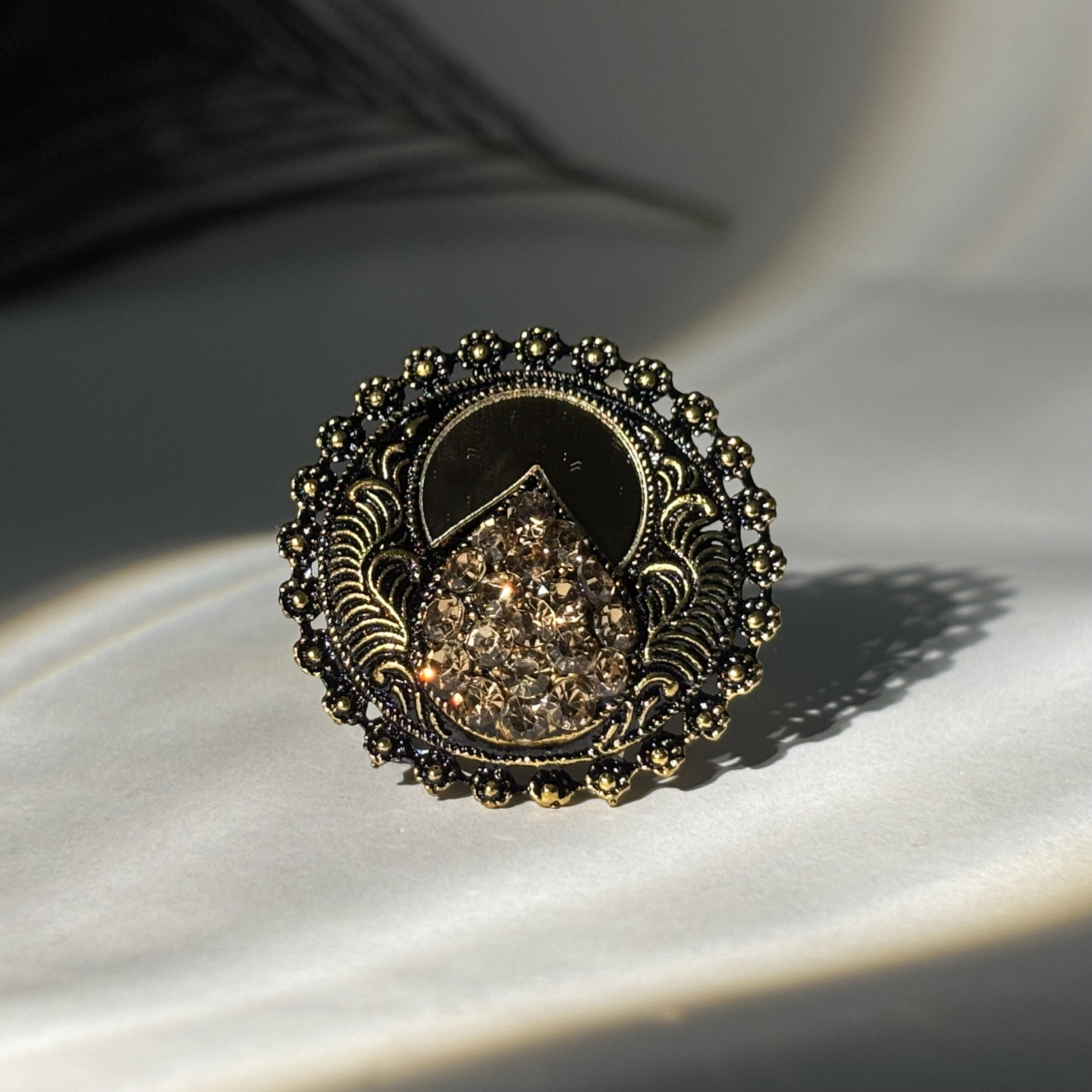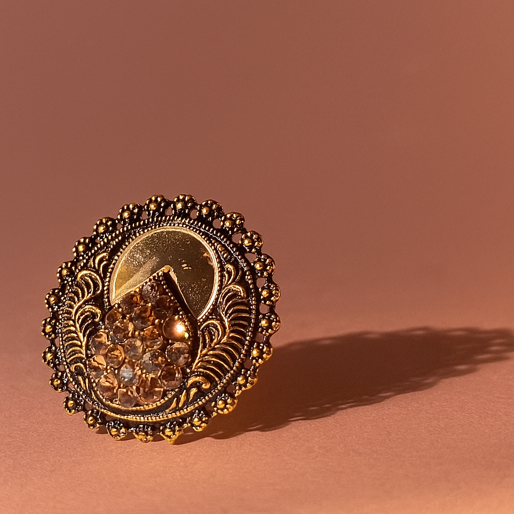 Elegant gold-plated antique ring with sparkling crystals and intricate design. Adjustable fit, perfect for weddings, parties, and ethnic occasions. A timeless jewelry piece for women.